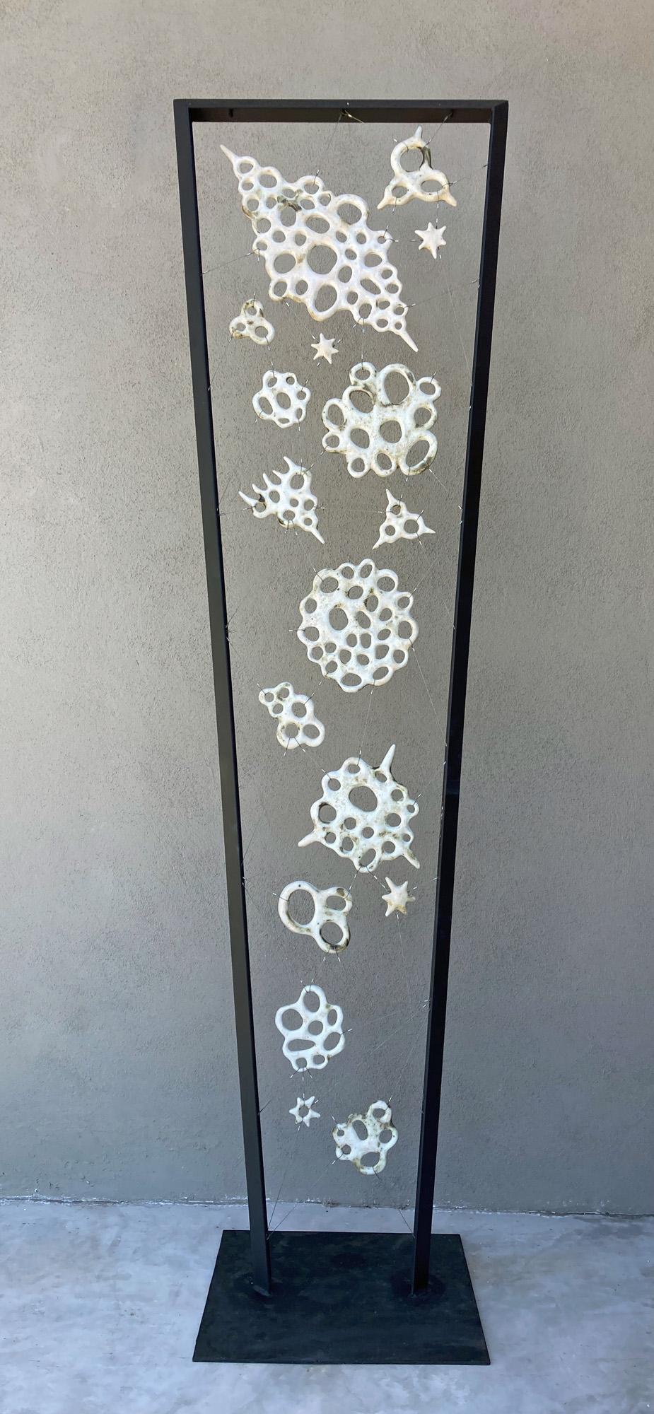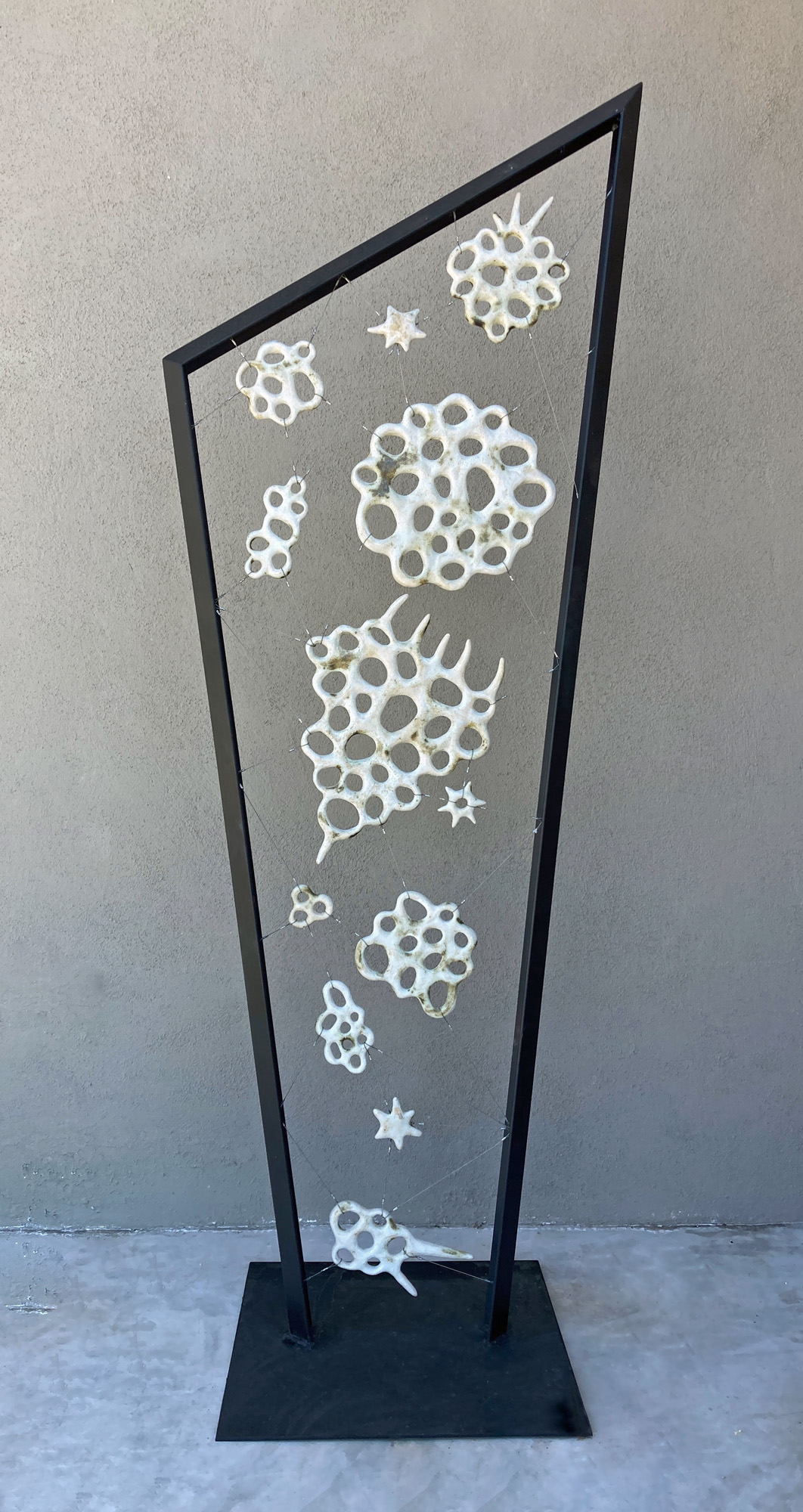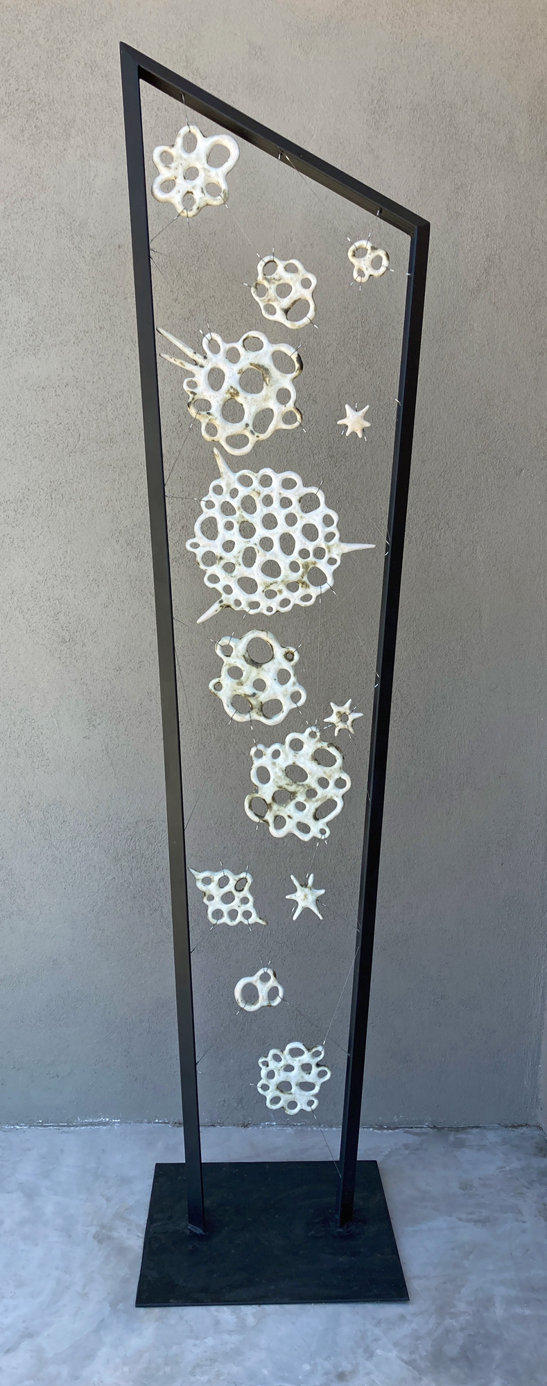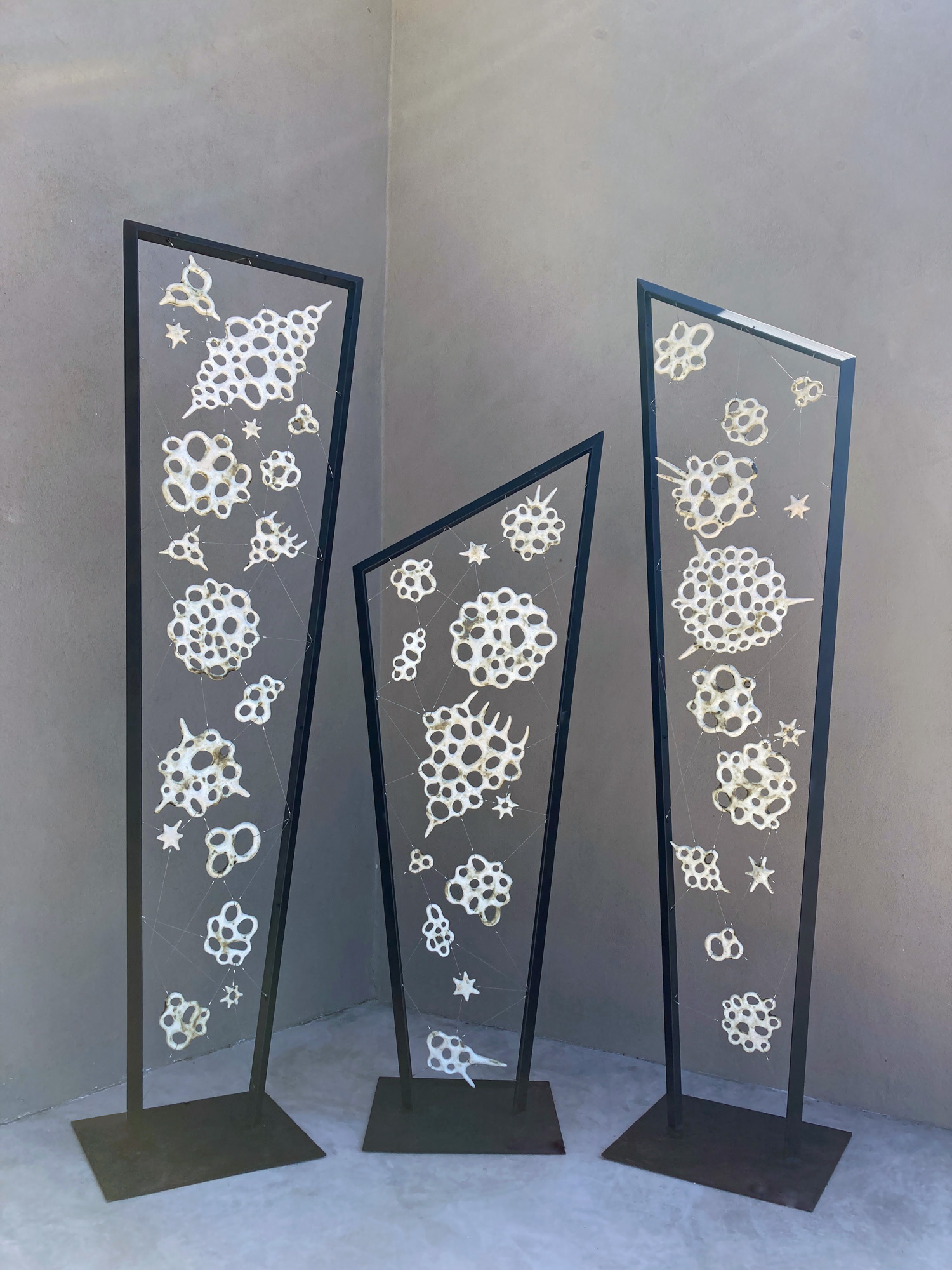 For H2O exhibition the artist’s aesthetic exploration of forms think of water as the common space where the elegance of water lilies meet the deepness and frailness of coral reefs on the brink of extinction. Through turning trash into beauty, the artist reminds us that real alchemy can only exist with our coordinated effort as humans to love and protect our only habitable ecosystem: planet earth.