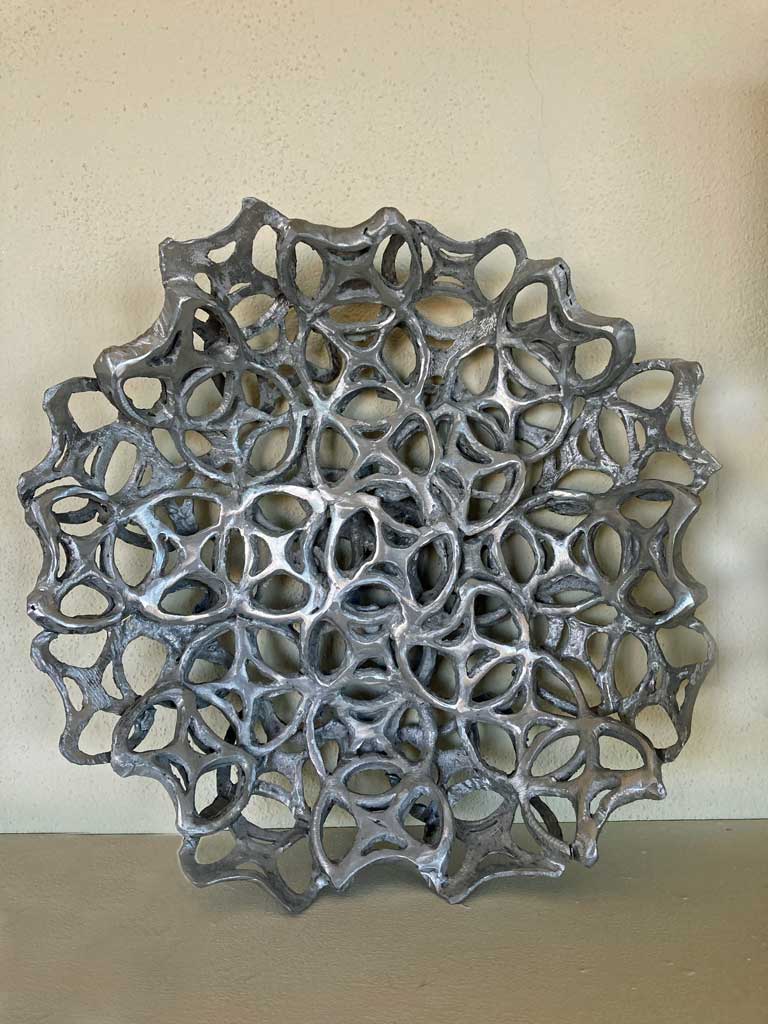 This Lost-wax aluminum-cast utilitarian sculpture is the result of an on-going art practice gathering and recycling hundreds of littered aluminum cans and six-pack single-use plastic rings that strangle and pollute our environment through the apparently innocent and never-ending beer beverage consumption in local beaches of Baja California Sur, Mexico.
