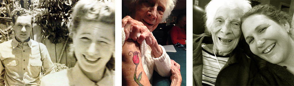 When she visited me in California a few years ago, my dog stole her hearing aids off the nightstand and ate them. She laughed at the idea that she must of had tasty smelling ears and wondering how she was going to explain it all to the doctor. Two winters ago, she let me tattoo her (with Sharpies) with her namesake after Christmas dinner – she thought it was hysterical and couldn’t wait to show the ladies in her domino group her new tattoo.