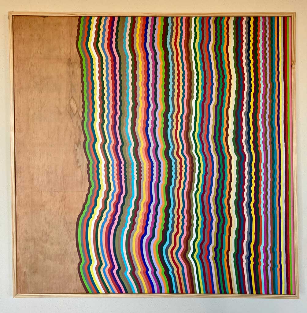 Art imitates life. This painting was made starting at the right-hand side with the light pink stripe. I tried my best to paint a straight, continuous stripe of the same width (based on the brush), trying not to lift the brush except to dip into the paint. When my hand wavered or I fumbled the brush, I let that be a record of the process – the accidents and missteps of life. With each stripe that followed in a different color, I followed the edge of the previous stripe so that, very gradually, the ripple effect emerged.